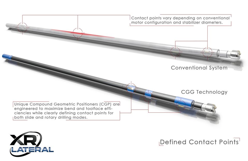 CGG (Compound Geometric Guidance) enables a 1.5° bend angle drilling motor capable of drilling 12°+/100' curve sections and drilling a near-gage hole while rotating. The CGP's (Compound Geometric Positioners) optimally position the motor in the hole for maximum bend efficiency. The major drilling benefit is an increase in rotary RPM while rotating and the potential to directionally drill while rotating due to a closer to gage hole and controlling rotate tendency with parameters and contact points.